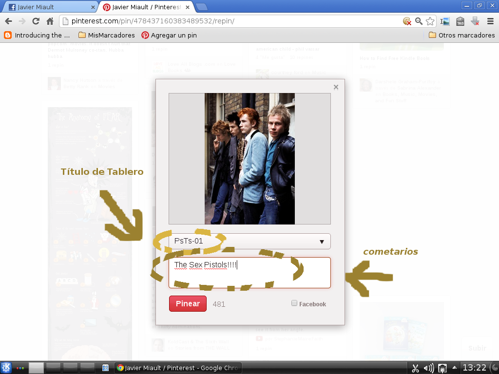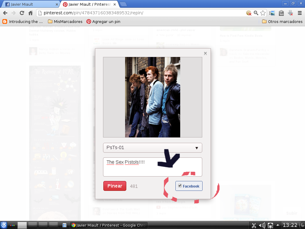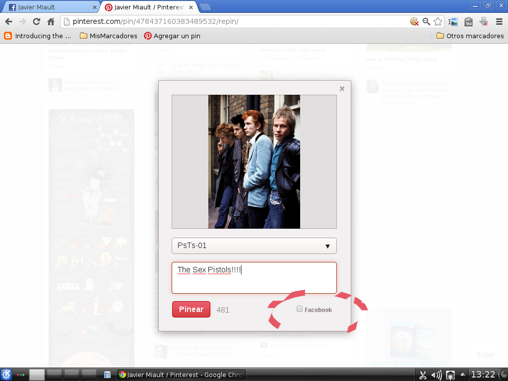 Imagen 6 = También tenemos la opción de sincronizar algunos de nuestros pines en facebook. Si la casilla del botón de facebook esta chequeada, el pin irá directo a nuestro muro (vale aclarar que pinterest es una aplicación del centro de aplicaciones de facebook por lo que la primera vez que queramos hacer esto desde facebook se nos preguntará por una autorización.