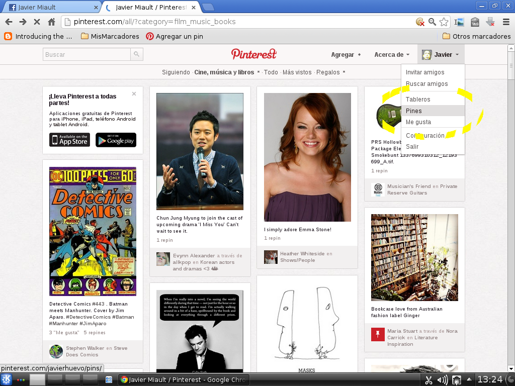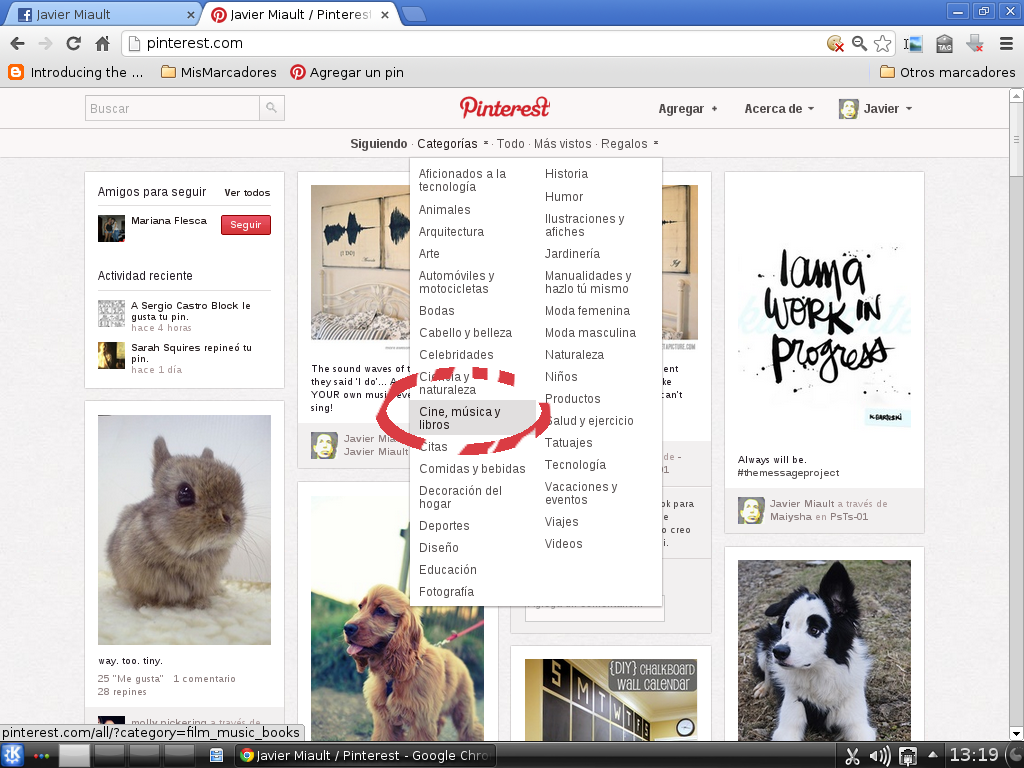 Imagen 2 = Clikando sobre el enlace categorías que está justo debajo del logo de Pinterest se abrir+a una lista desde la que seleccionamos el estilo de "pines" que deseamos buscar. En este caso yo seleccioné "Cine música y libros".